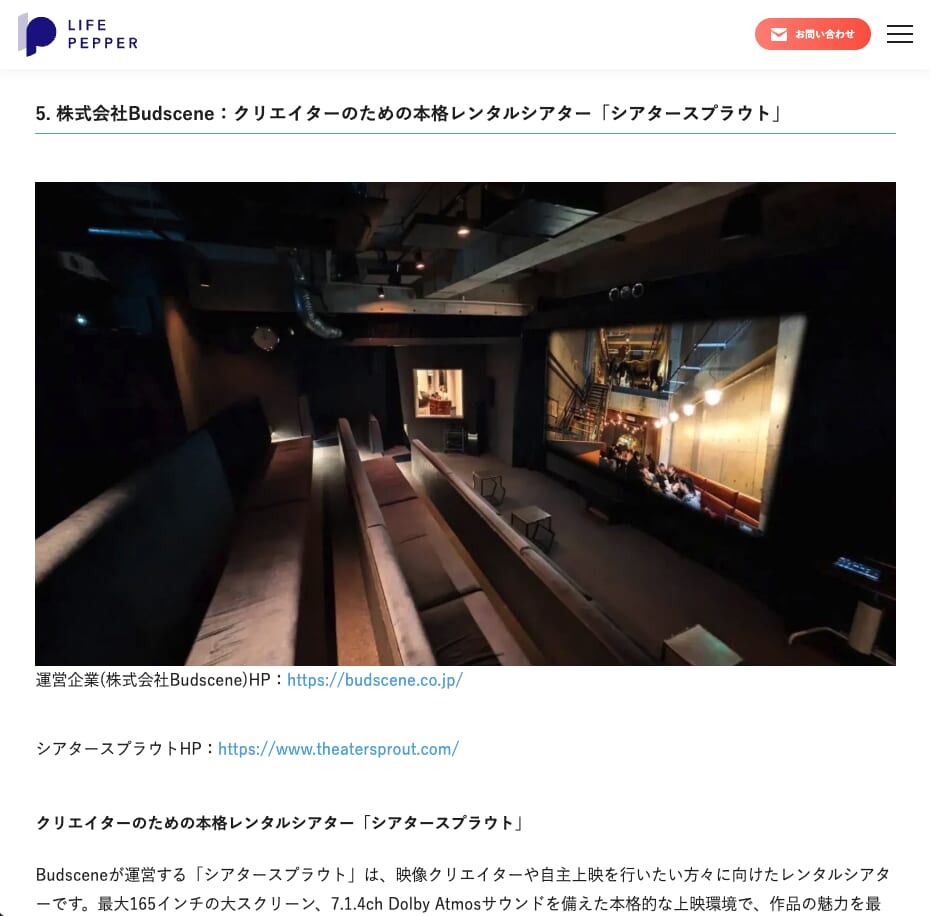Webメディア『LIFEPEPPER』にて、当社のシアター「Theater SPROUT」が紹介されました。